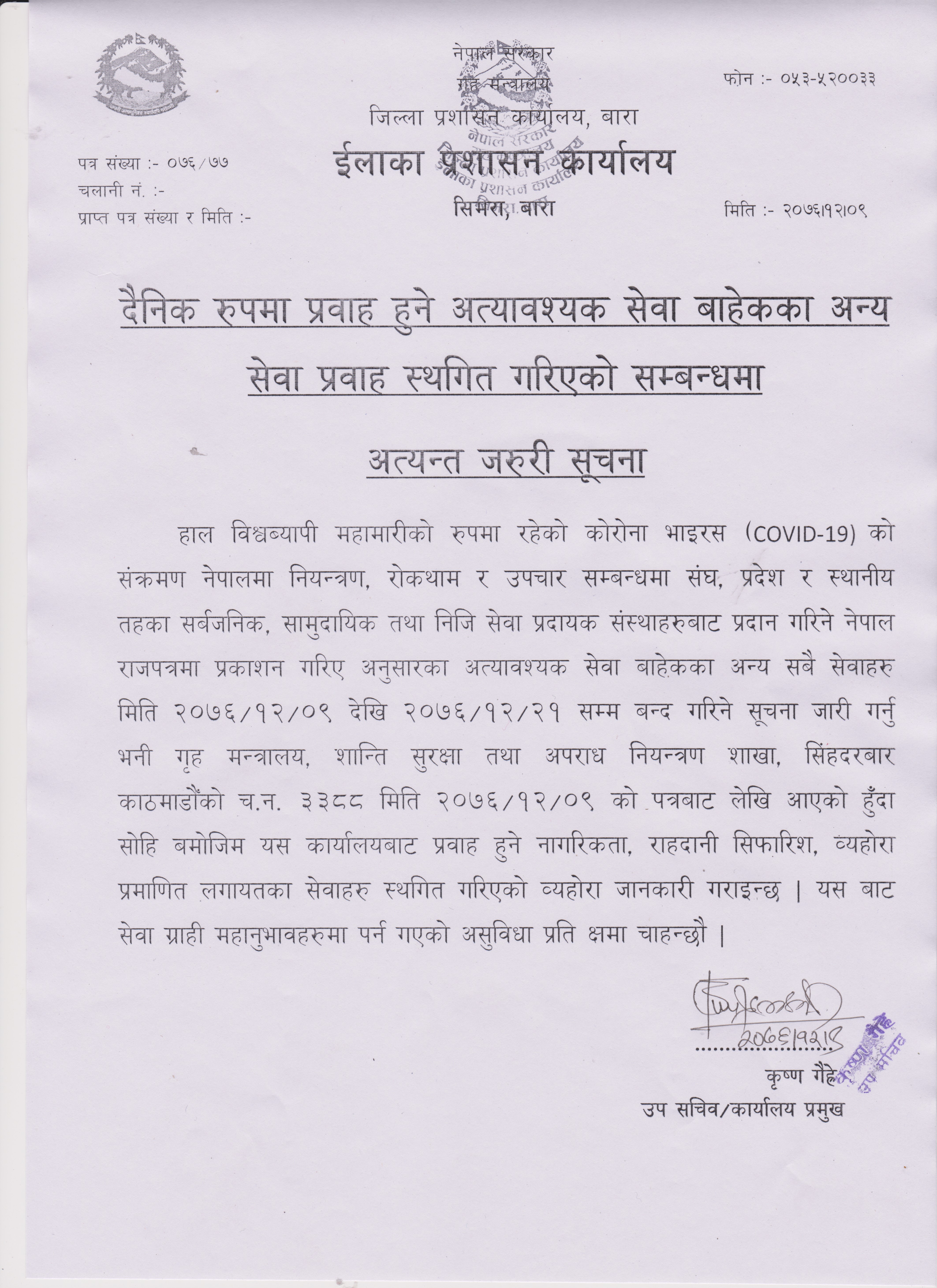 दैनिक रुपमा प्रवाह हुने अत्यावश्यक सेवा बाहेकका अन्य सेवा प्रवाह स्थगित गरिएको सम्बन्धमा अत्यन्त जरुरी सूचना